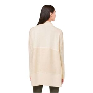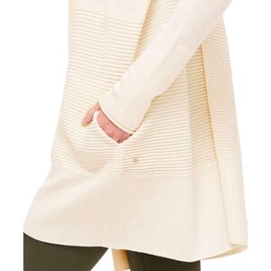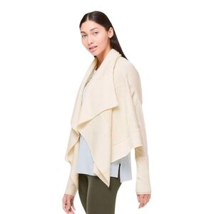 Experience the perfect blend of comfort and style with this cream cardigan from Lululemon Athletica. Crafted from premium Merino Wool, it offers a soft, cozy fit ideal for layering and year-round wear. This versatile wrap can be worn two ways — wear it long for a cozy look or flip it upside down for a cropped silhouette with a cascading collar.