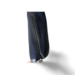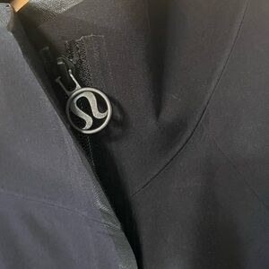 Sleek Lululemon softshell jacket in black. Made from water-resistant, 4-way stretch technical fabric with a smooth matte finish. High funnel collar, asymmetrical zip front, and waterproof zip pockets. Perfect for transitional weather and urban activewear.