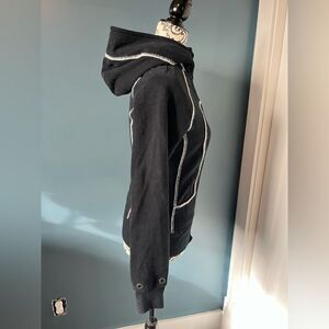 Elevate your activewear collection with this Lululemon Special Edition Scuba hoodie. The design features a form-fitting silhouette, a high neckline, and a cozy hood for extra warmth. Contrasting white stitch detailing lines the zipper and contours the body for a striking visual effect. A hidden pattern inside the hood adds an unexpected touch of elegance to this casual piece, making it a versatile addition to any wardrobe.