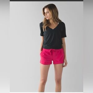 Experience the perfect blend of style and comfort with lululemon athletica's high waist dark pink shorts. These shorts feature a flattering high waist design and a comfortable elastic waistband, making them ideal for yoga or casual summer outings. Crafted from lightweight fabric, they offer a relaxed fit with a flowy leg, ensuring ease of movement and breathability.
