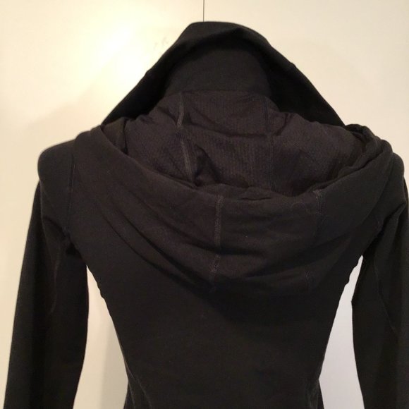 This fitted, hooded jacket was designed as an all-in-one cover up to keep you warm as you make your way to and from your neighbourhood yoga class. The long length covers your rear and the slim fit layers easily over your tights.