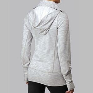Lululemon Stride zip hooded jacket. Striped. Heathered grey and white. Size 2, see pictures for measurements. High collar. Closes with a front zipper. Gentle signs of wear on the metal parts of the zipper as seen on pictures. No stain, no rip. Non smoking house.