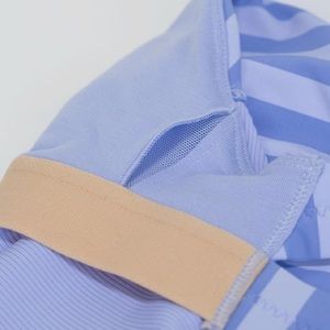 Crossed straps and an open/ low back with a strap across. Striped front and back with ribbed panels on both sides. Ruched sweetheart neckline. Smooth stretchy technical fabric. Built in sports bra.