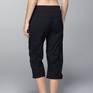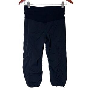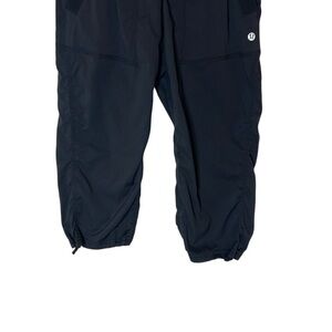 Lululemon Studio Crop Black When you leave the beach you put a sarong over your bikini. These crops are yoga's sarong. Why we made this There's a time and a place for everything. Unsurprisingly, the time for hot yoga gear is moments before we get on our yoga mats in a room where the dial is set to fevered mutterings. We designed these crops to pull on over our yoga gear and get us to and from the studio without causing a scandal. Key features adjust the fit and length by pulling the continuous drawcord in the bottom hem tighten the stretch drawcord in the waistband for a snug fit stow your essentials in the deep, COOLMAX® pockets on your hips there's a secure key pocket hidden in the left hip pocket chafe-resistant flat seams don't rub sweaty skin the wrong way Tech specs designed for: yoga, to-and-from fabric(s): Swift, COOLMAX® properties: moisture wicking, preshrunk, chafe resistant, breathable rise: medium inseam: 19 3/4" hem sweep: 19 1/2" Size 2 Measurements in photos Very good used condition