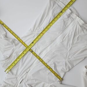 Excellent pre-owned condition, Lululemon Such A Cinch hooded water repellent, full zip white jacket with tulip hem, size 10.