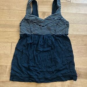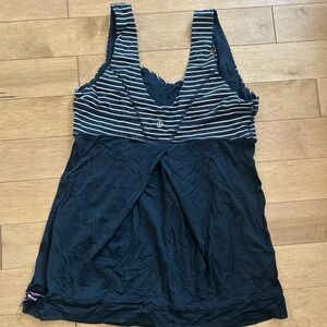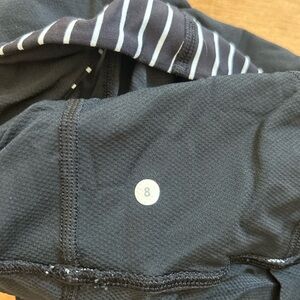 Lululemon Tame Me athletic tank top women's size 8 in black / parallel stripe black & white. This tank is designed to go over full support sports bras for double the coverage. Features wide straps for extra comfort, moisture wicking, chafe resistant flat seams, and a cinchable draw cord to prevent riding up.