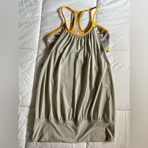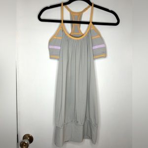This Lululemon tank is gorgeous. Picture doesn’t do it justice. It is a halter style with a bralette underneath . It is a vibrant light gray on the outside with lavender and yellow stripes on the bralette. This tank is in excellent used condition. Very minor pilling on the bralette as seen in the last picture.