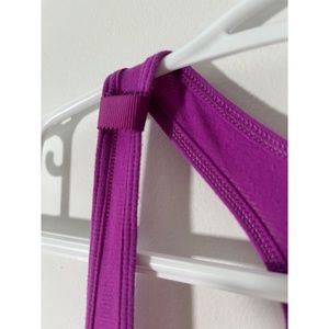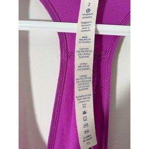 Size 2. Lots of life left in this soft, flowy lulu tank! Pink/purple colour. Perfect for yoga and other low impact activities.