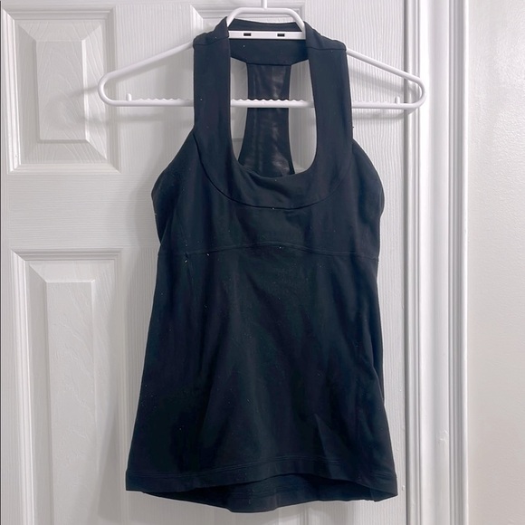 This sleek black tank top from Lululemon Athletica features a fitted design with stylish cut-out details. The sleeveless style and high neckline make it a versatile piece for both casual and dressy occasions.