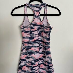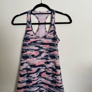 Racer back pink camo lululemon tank top. No size dot- but I think it’s a medium-large. Comfy and cute!