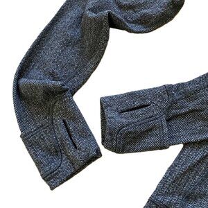 Lululemon "Think Fast" pullover long sleeve shirt has 1/4 zip neckline with cozy shawl collar in black contrast fabric. Zip pocket at left waist. Classic grey herringbone pattern. Super-soft, stretchy "Rulu" fabric is 69% nylon/22% polyester/9% spandex, machine washable. Women's size "8", see below for garment measurements.