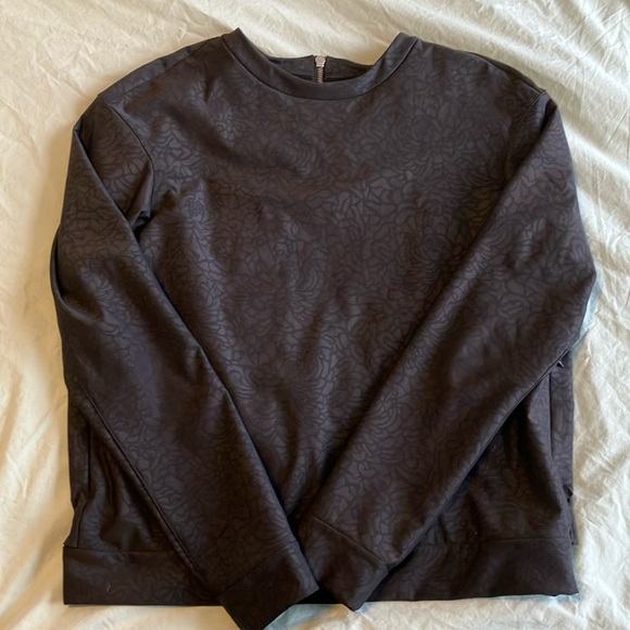 Super unique lululemon sweater. Feels like a luxtreme fabric, but I found it surprisingly warm. Size 8. Beautiful flower pattern, cute detailing at the back with a 1/4 zip at the back.