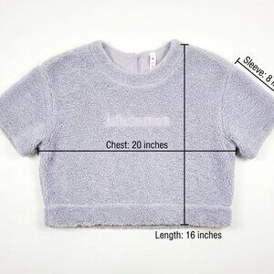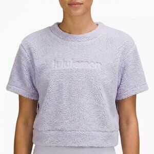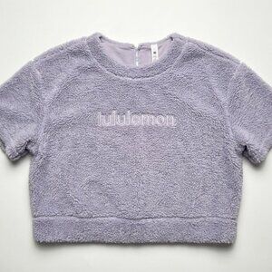 Lululemon fleece crop tee, lavender sherpa top, cropped fuzzy shirt women, Lululemon size 8 fleece, soft purple crop top, cozy short sleeve fleece, athleisure cropped tee, womenβs Lululemon lounge wear, plush fleece top.