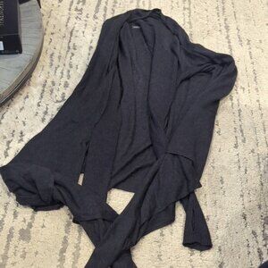 Universal is an understatement - we created this lightweight sweater wrap to be a versatile and warm solution in our yoga closet. This sweater works well with tights as the length provides great bum coverage. The long front layers allow for multiple styles and also look great left unwrapped and flowing free.