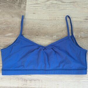 This is a royal blue sports bra with a gathered front, v neck and v back by Lululemon.