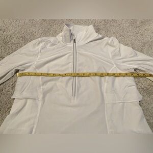 This is an older lululemon piece. Features a quarter zip. Some mesh/lace accents on the sides. Sleeves have a stretchy fabric. Thumb holes. Top is pretty stretchy and is a bit of a thinner material.