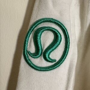 Stay cozy and stylish with this vintage-inspired Lululemon zip-up hoodie. This classic piece features a crisp white color with green striped ribbed cuffs and hem for a sporty, retro vibe. The hoodie includes a full front zipper, two front pockets, and an adjustable drawstring hood with matching green accents. The signature Lululemon logo is embroidered on the sleeve, adding a touch of brand recognition.