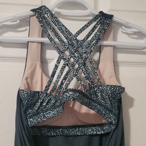 Lululemon blue open back tank top with built in sports bra. It comes with the padding. Sports bra has a blue dotted pattern. Excellent condition!
