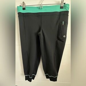 Lululemon crop pants with a zip pocket on the front left side -size 8. This item was not worn very much - inner store tag still in place. There is a tiny amount of pilling on the inner legs seam as pictured in the photo. Still in good condition overall. Refer to last few photos with measuring tape for a visual for their length.