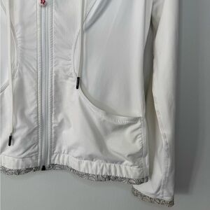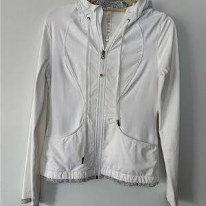 Stay stylish and comfortable with this sleek white hooded jacket. Perfect for any casual outing. Measurements in photos