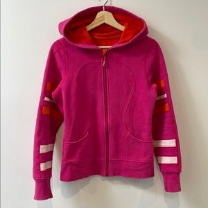 Vintage Lululemon zip up Y2K hoodie. Size 6. Hot pink with white and orange stripes on sleeves and orange lining.
