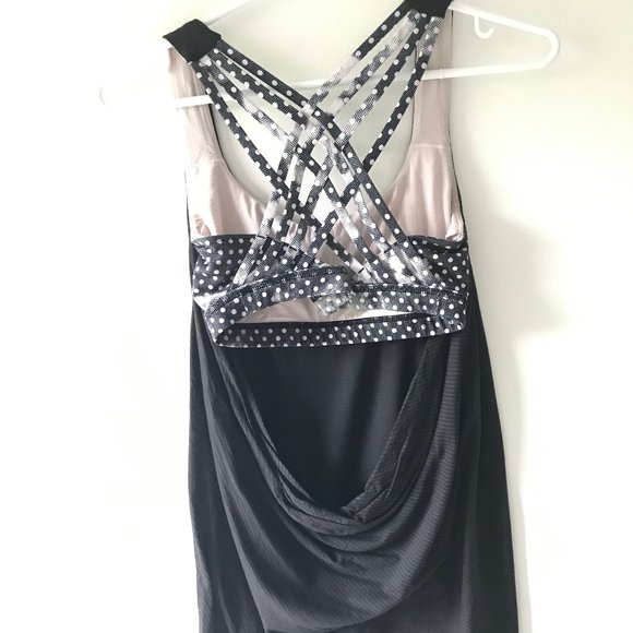 Very cute back with a scoop! Very lightweight material and excellent support in the bust. Material is black with very thin lines. Straps are black, white and light pink.