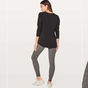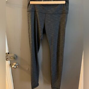 Lululemon activewear set featuring a black top and gray leggings. Perfect for workouts.