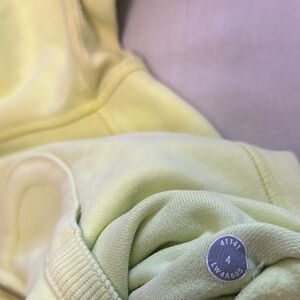 This vibrant yellow/green hoodie jacket from lululemon athletica combines style and comfort with its lightweight material and full-length zipper. Perfect for athleisure, it features an attached hood and a sleek, solid design ideal for casual outings.