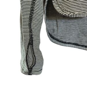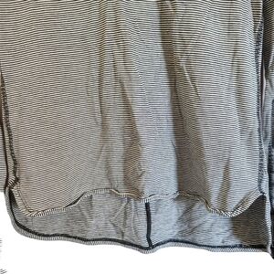 Lululemon long-sleeve,pull-on, black and gray, striped shirt. Black thread around the neck and down the back of the shirt, thumb holes, front is longer than the back. Super comfortable, stretchy, lightweight and in great condition.