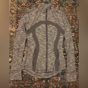 Stylish gray zip-up athletic jacket with a sleek design. Perfect for workouts or casual wear. Tags removed but fit size 4