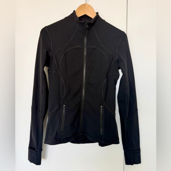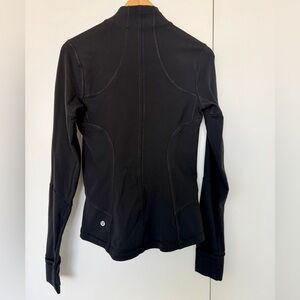 Classic Lululemon zip‑up jacket in a sleek black performance fabric. This is an older model (the size dot does not have the newer numeric code around the perimeter), but it’s in excellent condition with no pilling, rips, stains, or wash wear. Fitted silhouette with contour seams, high collar, and zippered pockets.