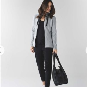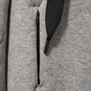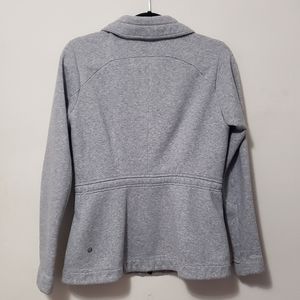 Lululemon athletica and go take off sweater in heathered gray color with zippered pockets and thumb holes. Naturally breathable cotton/polyester fabric, feels thick and soft. Has cinchable drawcord around the