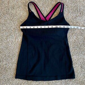 Lululemon black tank top with hot pink mesh cross cross straps. Women’s size 4-6