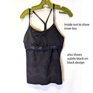 This Lululemon tank top has very subtle black and grey pattern, Size 6. The tank top has an attached inner bra.