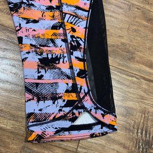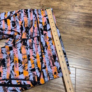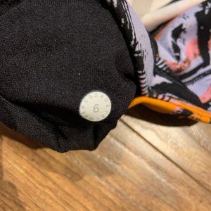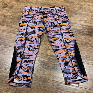 Awesome fun bright pattern on these Lululemon colourful mesh side capri leggings. They are in excellent condition. Blend of purply/pink orange and black. Size 6.