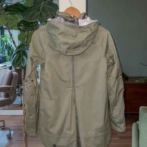 Olive green fitted rain coat with hood (hood is convertible). In good condition.