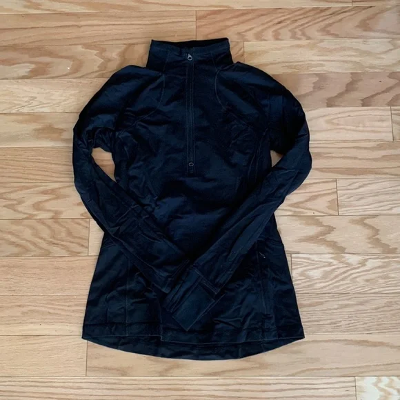 Mid layer lululemon black half zip. Brushed on the inside so it’s cozy for colder weather. Fold over cuffs to keep your hands warm. Size 8