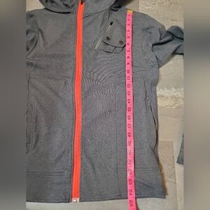Lululemon heathered grey jacket. Red-orangeish  touch. Y2K. Men size M, see pictures for measurements. Excellent condition. Small subtle flaw at the front as seen on pictures. No stain, no rip. Non smoking house.