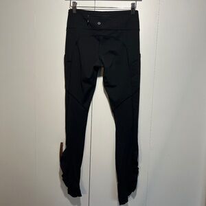Lululemon leggings with pockets (sides and back zipper pocket). Rouched mesh detail on lower legs. Full length. Black, women’s size 6. Good condition.