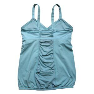 Lululemon light teal tank with ruched mesh back and zipper pocket, size 8. Missing bra pads and minor wash wear, no other flaws. Ptp 14.5", length 24.5".