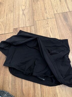 Classic black athletic skirt with built-in shorts. Smooth, stretchy fabric and subtle horizontal panel details. Comfortable waistband for active days. Very flattering