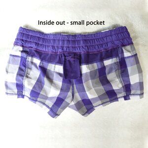 LULULEMON ATHLETICA plaid athletic shorts in purple grey plaid. Credit card or money pouch or keys pocket inside front waistband. Not size tag so please check measurements.