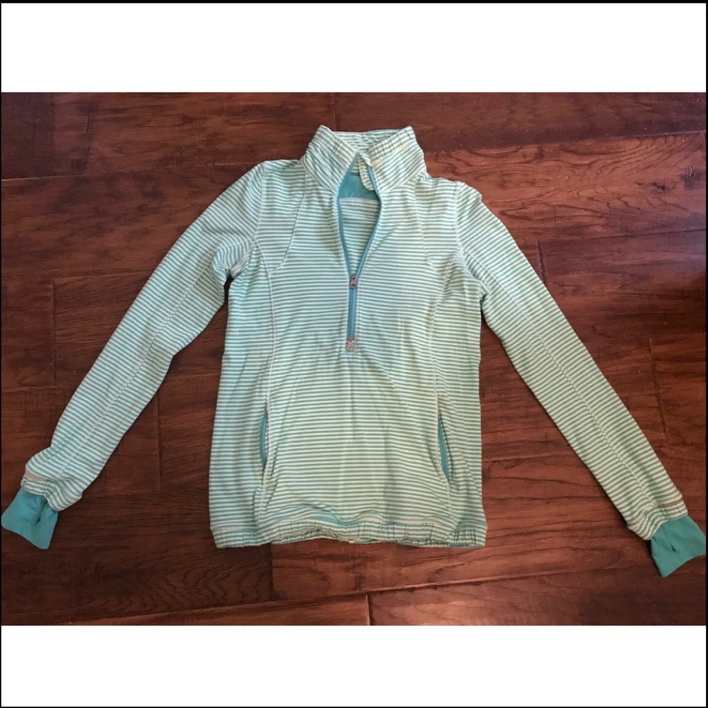 Beautiful barely worn green and blue stripped lululemon pullover. Has zipper pockets on front.
