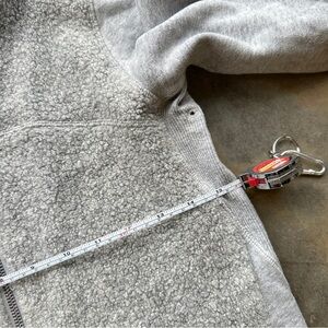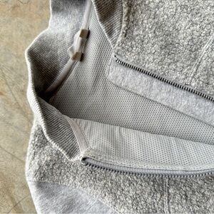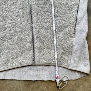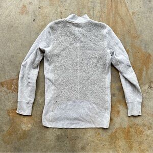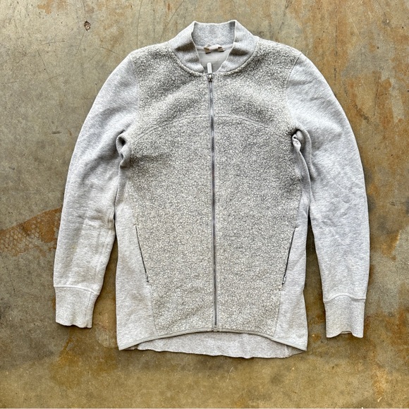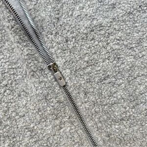 Stylish gray zip-up sweater with textured front. Features a full-length zipper and side pockets.