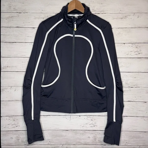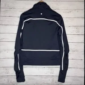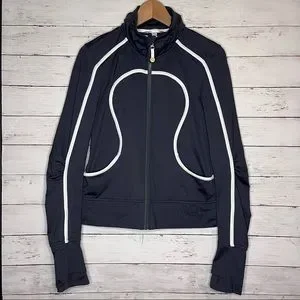 Dark grey and white track jacket. Trackstar fabric is wicking, breathable and has stretch. Sleeves have thumbholes. Size 6 and in excellent condition.