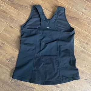 Black lululemon workout tank with built in bar support. Has mesh bar support inside and a mesh pocket in the back. Excellent pre loved condition. Size lulu 4