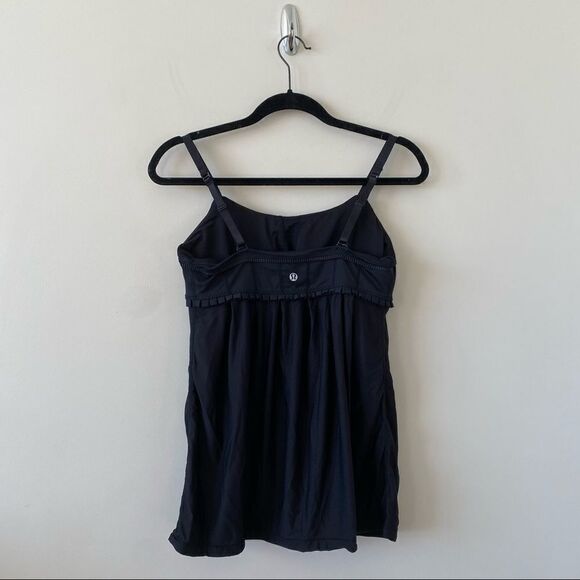 Super cute lululemon black ruffle detail tank top!! Straps are adjustable and can be cross crossed.
