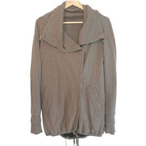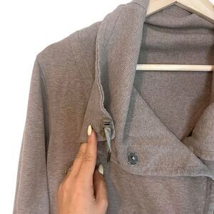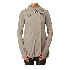 Features: snap closure, fold over collar, thumb holes, toggle pull at hem, ribbed cuffs and elbow patches, lined, activewear, yoga