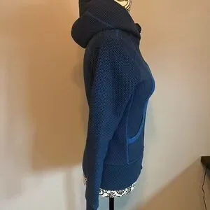 Elevate your athleisure wardrobe with this stylish blue hoodie, featuring a contrasting blue accent along the side panels and a snug, form-fitting design. The hoodie is crafted with a high neck and deep hood, providing warmth and comfort. It's complete with a full-length front zipper for easy layering, thumbholes for secure sleeve positioning, and a subtly textured fabric that adds a touch of sophistication to the casual silhouette.