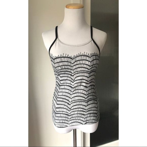 Lululemon yoga tank with lace design. In good overall condition but has some pilling . Built in shelf bra but no inserts. Size tag has been removed so refer to measurements for sizing